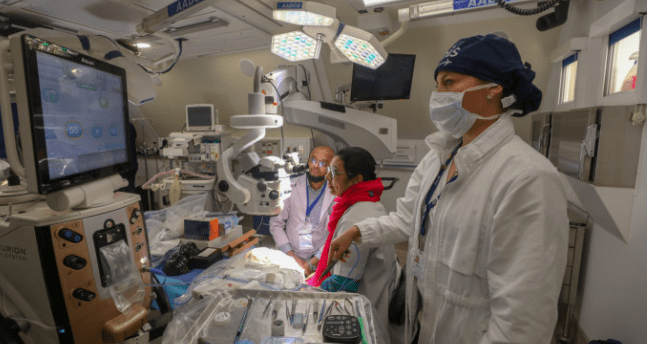 বিমানের ভেতরেই চলছে চক্ষু চিকিৎসকদের প্রশিক্ষণ। অপারেশন থিয়েটারসহ হাসপাতালের বিভিন্ন ইউনিটে বিশেষজ্ঞ চিকিৎসকরা হাতে কলমে প্রশিক্ষণ দিচ্ছেন বাংলাদেশের বিভিন্ন হাসপাতালের চক্ষু ডাক্তারদের।