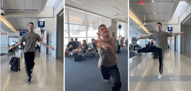 এয়ারপোর্টের ভেতরে নাচ করছেন ব্লেক ম্যাকগ্রাথ। ছবি: ব্লেক ম্যাকগ্রাথের সৌজন্যে